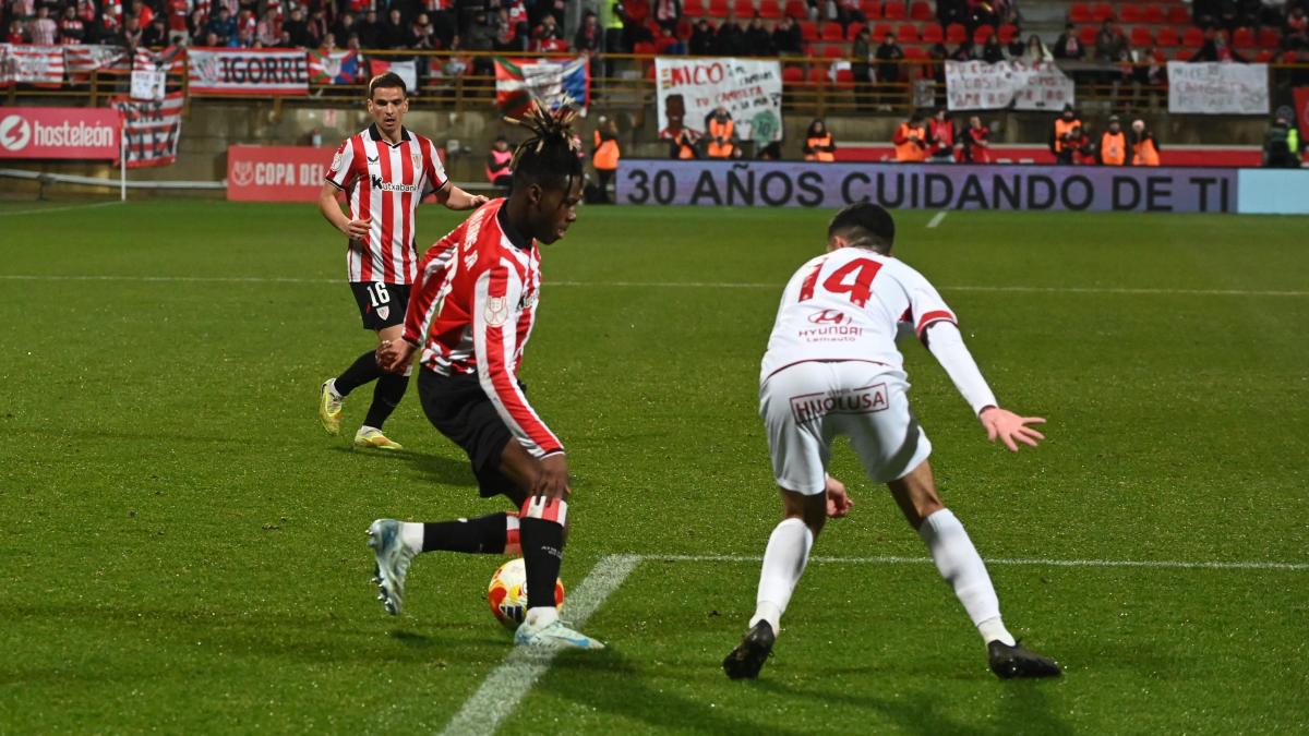 El Athletic se ganó los cuartos por la vía del sufrimiento ante una Culutural Leonesa que tuvo contra las cuerdas a su rival, pero no acertó a tumbarle. La expulsión de Paredes en torno a la hora de juego sólo vino a complicar más aún la vida a un equipo bilbaíno que, tras nivelar tres desventajas en el marcador, sentenció en la prórroga con un gol de penalti de Unai Gómez. Los leones supieron apretar los dientes a partir de ahí hasta cantar victoria. El conjunto de Ziganda supo cómo jugar de tú a tú a este equipo rojiblanco venido a menos. Calero batió al esta vez titular Padilla en dos ocasiones y en ambas respondió Guruzeta con sendos tantos. Luego llegó el turno de los penaltis. Primero a favor local con diana de Sobrino y después visitante con gol de Sancet. Todo ello antes del descanso. La roja a Paredes por decir algo a un linier pareció el principio del fin de los leones, pero nada más lejos de la realidad. Los cambios introducidos por Valverde sobre la marcha dieron empuje y energía a un conjunto visitante que aprovechó la que tuvo. Unai Gómez remató al palo y Yayo, que al que poco antes le habían anulado un gol vía VAR, derribó a Nico Williams tras el rebote. El propio Unai Gómez marcó y selló el pase del Athletic en la prórroga. Ziganda afrontó la visita del Athletic con una rotación múltiple. El técnico navarro hizo que repitieran los jugadores que fueron titulares en las tres eliminatorias previas de su equipo y dosificó fuerzas llevando a cabo hasta siete modificaciones respecto al once que venía de presentar en Liga en Andorra. Víctor García, Barzic e Hinojo repitieron así en la zaga y Salu Diallo en el centro del campo. Valverde se anduvo con menos rodeos a la hora de tirar de alineación titular. El entrenador del Athletic, consciente de la debacle en Arabia Saudí ante el Barça y de lo que estaba en juego, apostó por un equipo muy reconocible con Padilla, eso sí, bajo palos en lugar de Unai Simón. Nico Williams, ausente ante el Barça, fue de la partida. Los locales se adelantaron recién superado el primer cuarto de hora con una llegada y gol de Calero que sorprendió a la zaga bilbaína. La reacción del Athletic no se hizo esperar al empatar diez minutos después con un tiro cruzado de Guruzeta. A los leones no les dio ni tiempo para disfrutar de este empate, puesto que tras el saque de centro otra irrupción de Calero desde atrás sirvió para poner el 2-1. Duro golpe para un equipo bilbaíno que volvió a aprovechar otro error en la salida de balón de los locales para que Guruzeta, a robo y pase de Galarreta, estableciera las tablas. Tablas efímeras porque acto seguido Vivian cometió penalti por mano a la salida de un córner y Sobrino adelantó a los leoneses de nuevo desde el punto fatídico. Entre desbarajuste y desbarajuste defensivo de ambos contendientes, a los bilbaínos les dio tiempo de empatar al borde del descanso. Nico Williams, con cabezazo previo al poste, fue derribado por su par y Sancet firmó el 3-3 de penalti. Ziganda reforzó el centro del campo en el inicio de la segunda mitad dando entrada a Yayo. Paredes vio la roja minutos después por decir algo a un linier tras haberle pitado una falta en contra. Flaco favor a su equipo en torno a la hora de juego. Valverde tuvo que quitar a Galarreta para meter a Yuri como central. Poco después dio entrada a Areso y Unai Gómez. El Athletic, con un menos, se metió en la cueva. Ziganda, mientras tanto, fue oxigenando a su equipo con más cambios. Izeta y Navarro completaron las sustituciones bilbaínas antes de la prórroga. Prórroga que empezó con gol de Yayo anulado a la Cultural vía VAR y penalti del propio Yayo a Nico Williams con gol de Unai Gómez desde el punto fatídico. Los locales no dejaron de intentarlo frente a un Athletic que, en inferioridad numérica durante casi una hora, supo hacerse fuerte atrás hasta cantar victoria. Increíble, pero cierto.